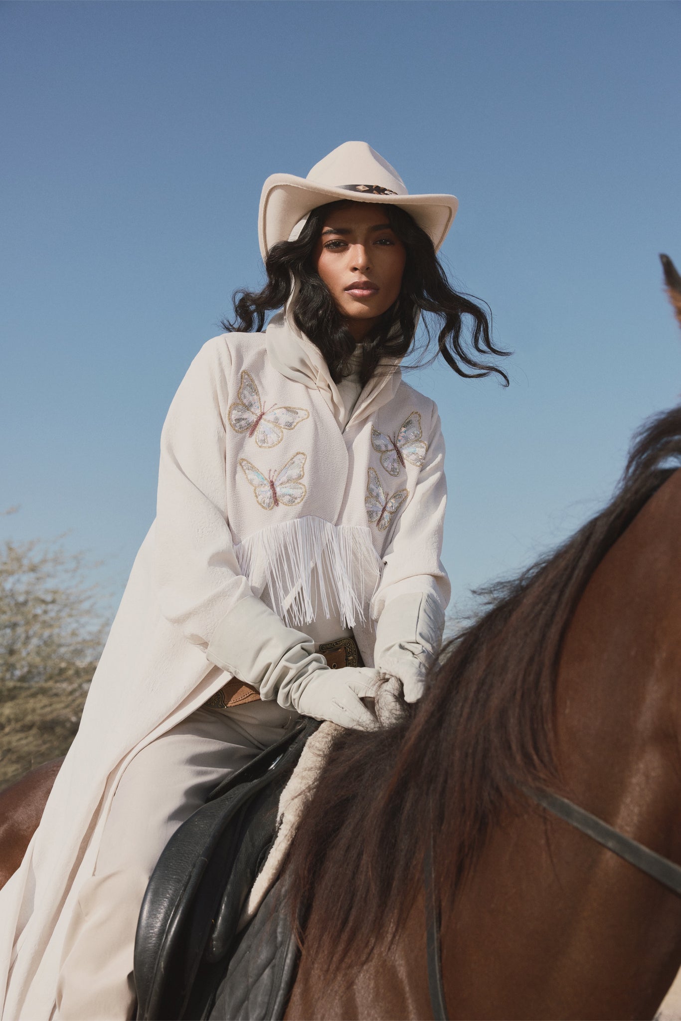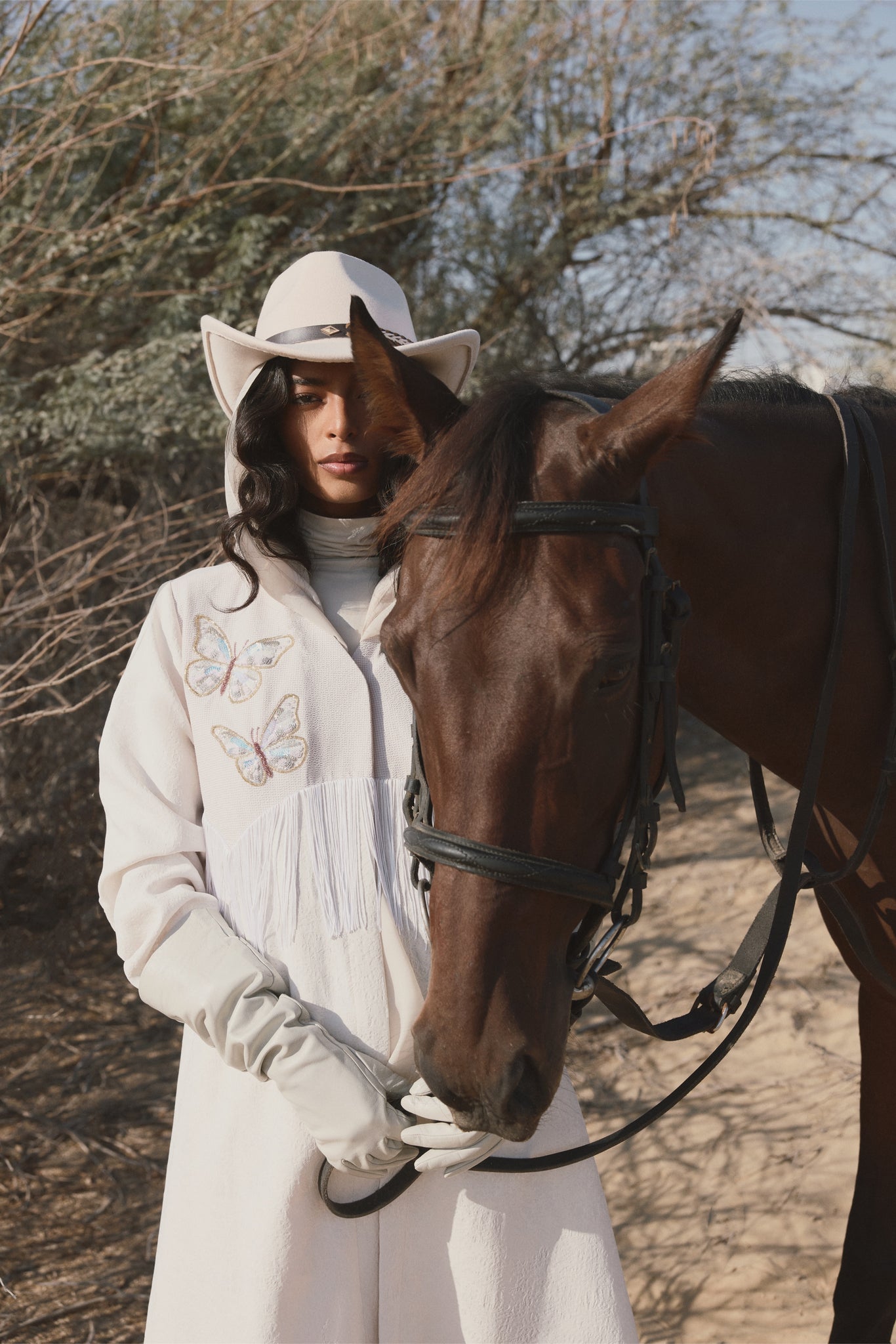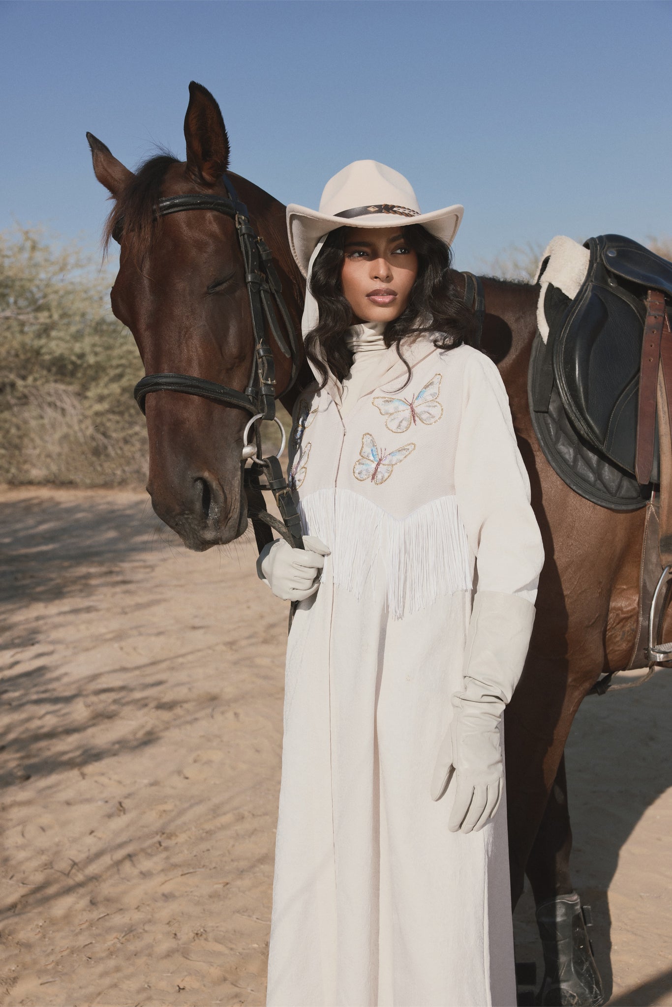 The Patsy Abaya features delicate hand-embroidered butterfly motifs on soft, creamy fabric, accented with subtle fringe for gentle movement. A modern, feminine design that brings effortless elegance to any occasion.