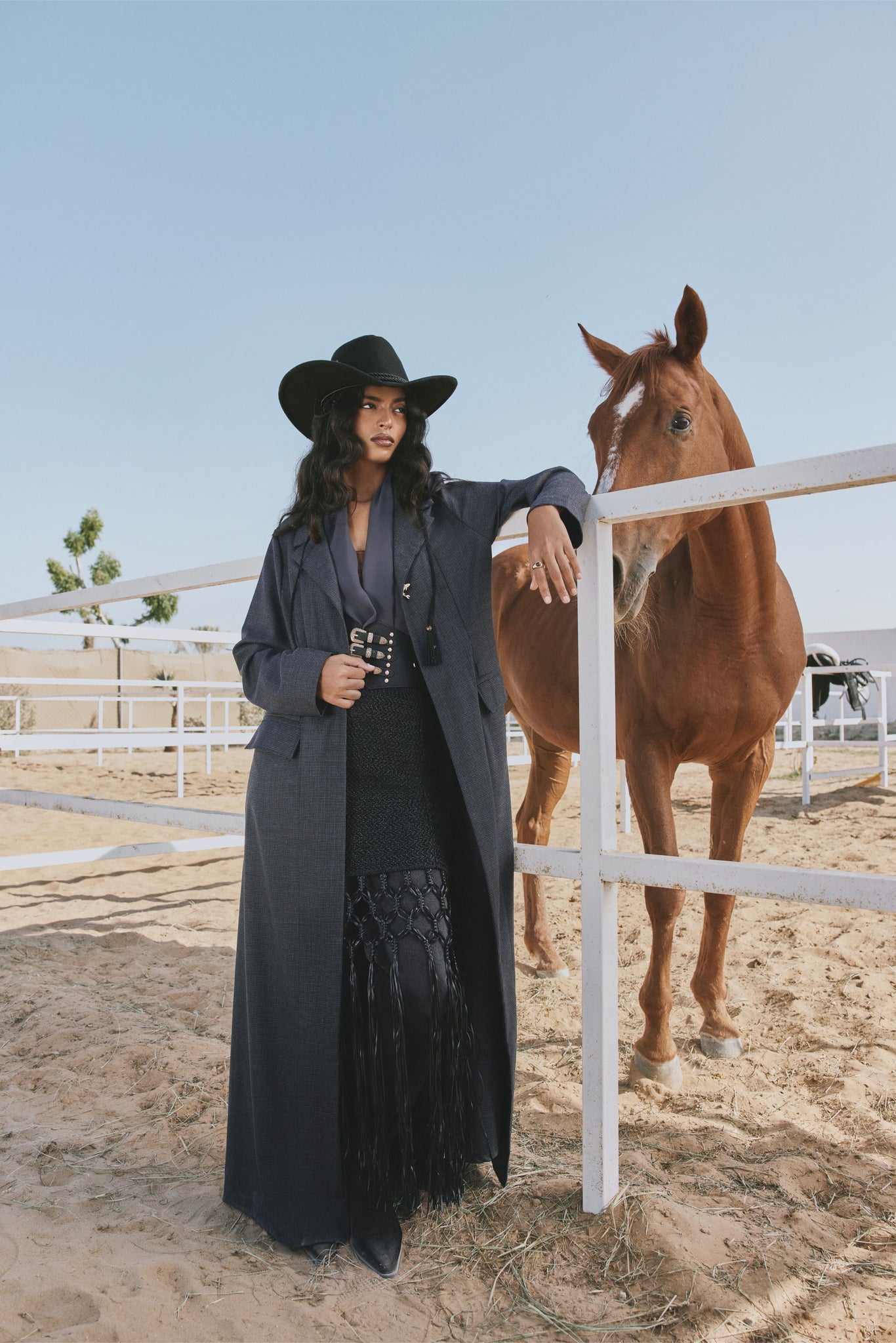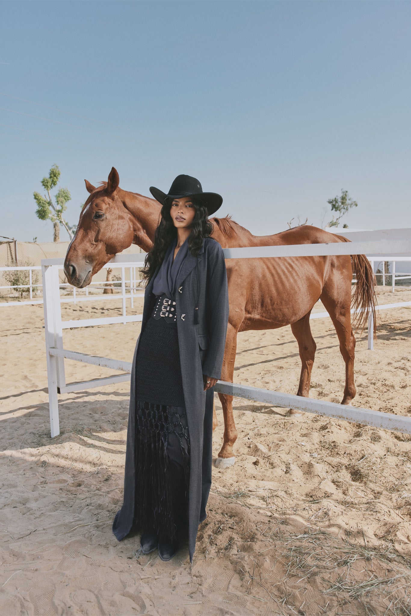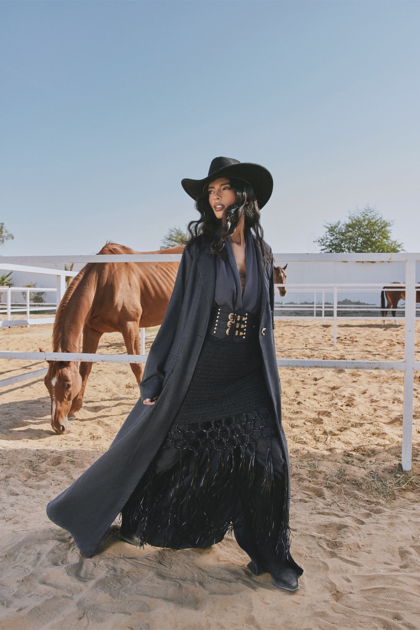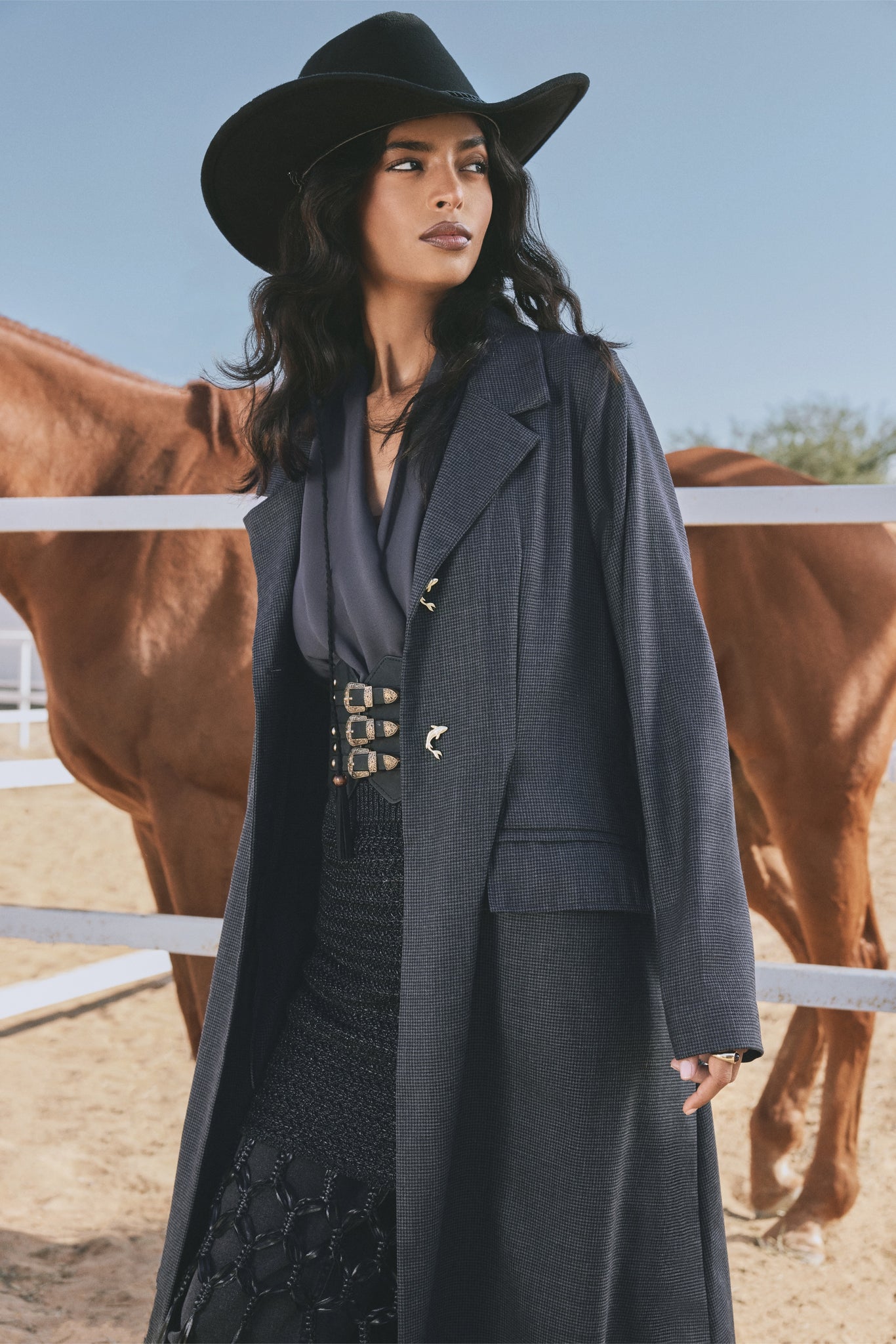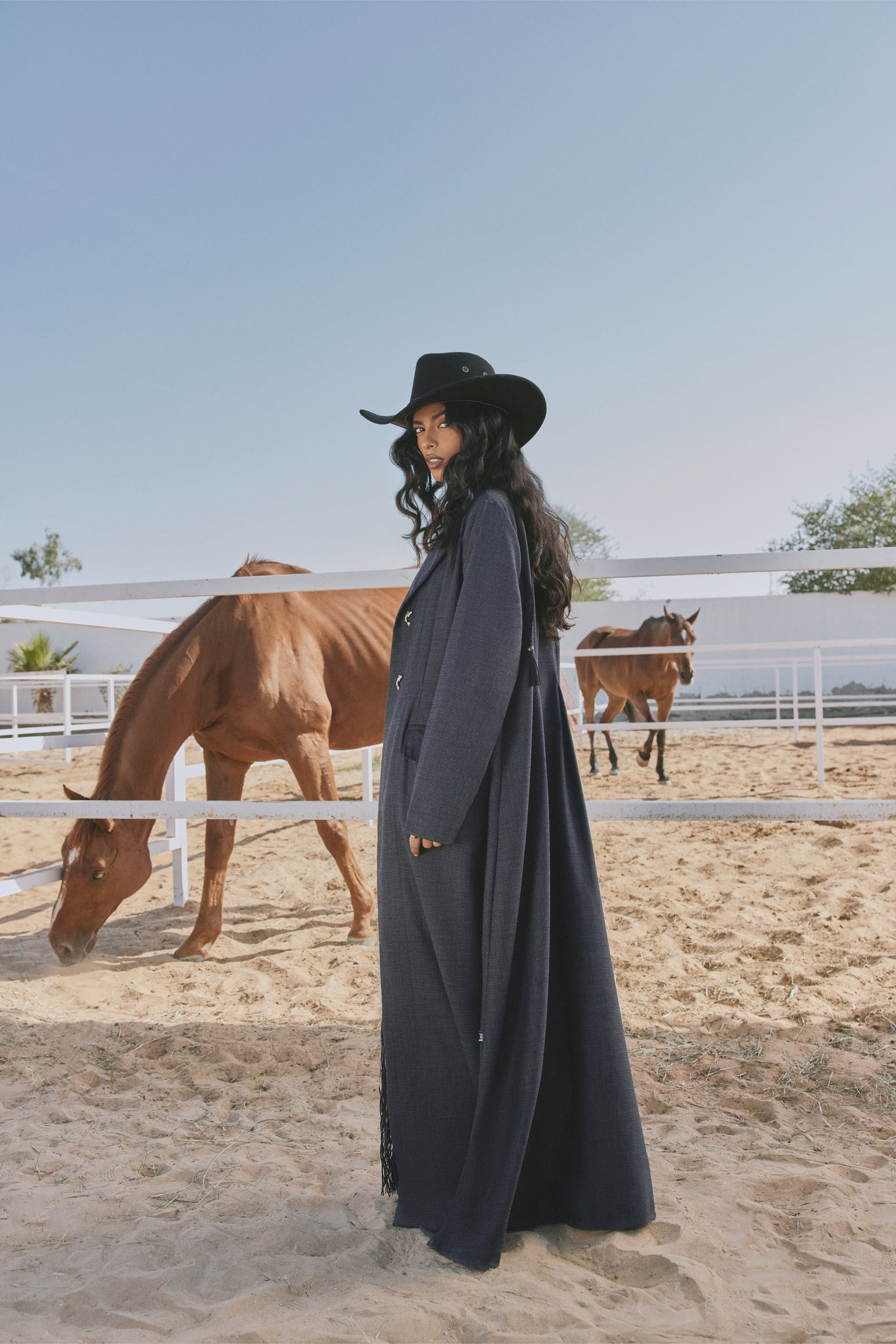 he Lyn Abaya brings a modern Western edge to classic tailoring. Crafted in deep charcoal fabric, it features a structured silhouette, fluid movement, and KOI’s signature gold button for a refined finish. Layered over a textured skirt with statement fringe, this look blends sophistication with bold cowgirl-inspired flair — perfect for day or evening wear.